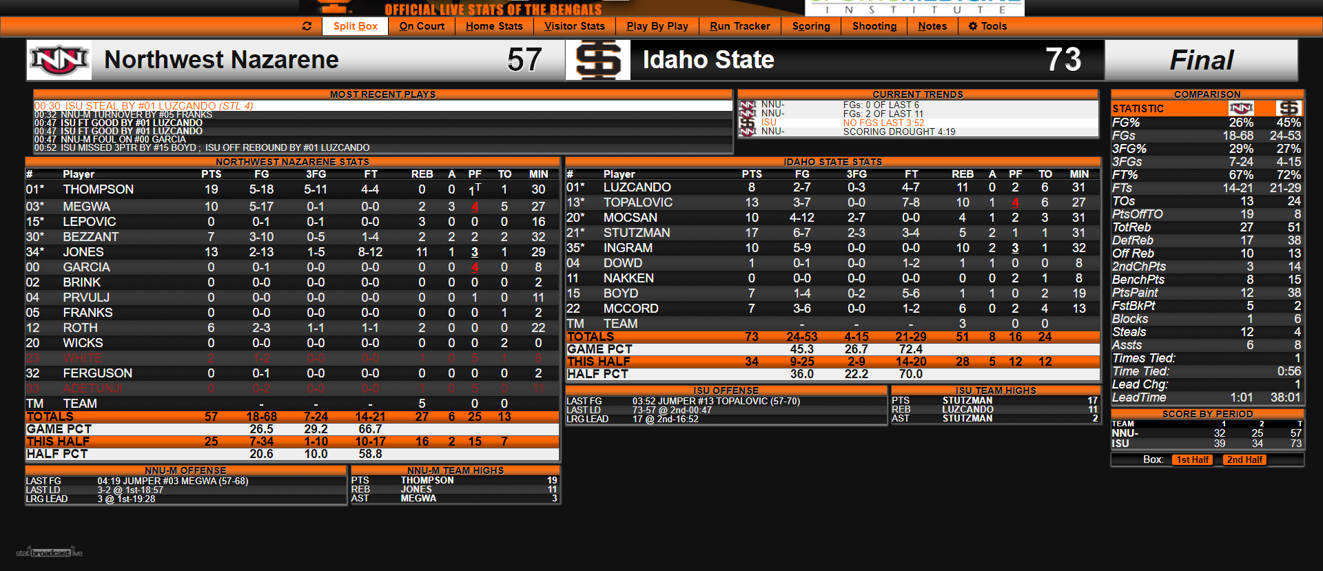 The up-tempo Crusaders offense, which looked to run even off made baskets, gathered 19 points off ISU turnovers, but by going with a smaller lineup, the Bengals slaughtered the Crusaders on the glass and in the post, outscoring NNU 38-12 in the paint and collecting a season-high 51 rebounds.