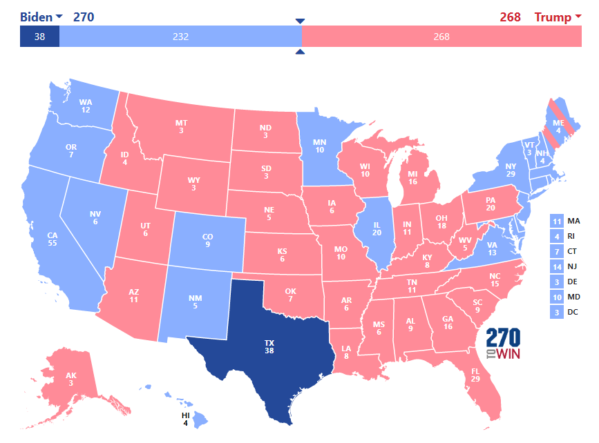 Not on that, but the entire election would be over for Donald Trump. Let’s say that Biden wins Texas on election night, but Trump manages to win Florida, Nevada, Georgia, Ohio, Michigan, Pennsylvania and Wisconsin. Trump still only makes it to 268 electoral votes, while Biden ends up at 270, the exact amount needed to win the electoral college. And it’s highly unlikely that Trump will win all of those states.