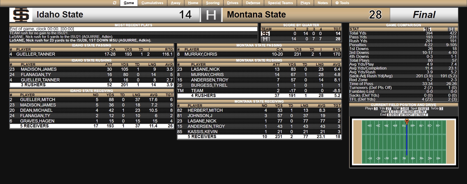 The Bengals took their second drive of the game back into Bobcat territory, but saw that drive conclude when Idaho State failed to pick up a fourth-and-two at the Montana State 29 when Ty Flanagan was stuffed on a run up the middle.